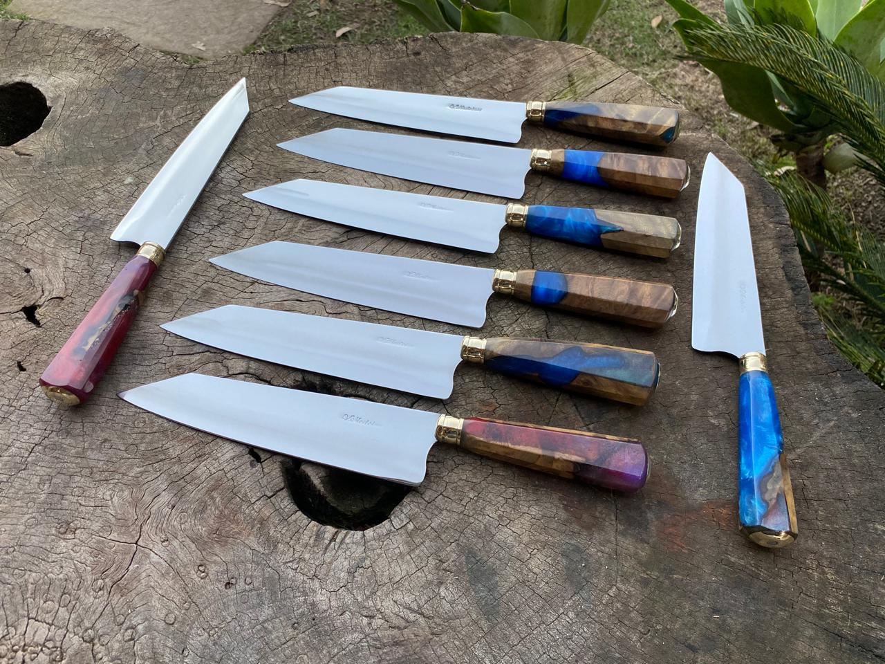 We work mostly with three different types of steel: Carbon Steel, Stainless Steel and Damascus Steel. Every knife will have its own treatment to reflect on its utility and style. Handles will be made of Native Brazilian Hardwood (Acacia, Jacaranda, Pau Brasil, Violet Rosewood), Custom Resin, Bone or Deer Horn.